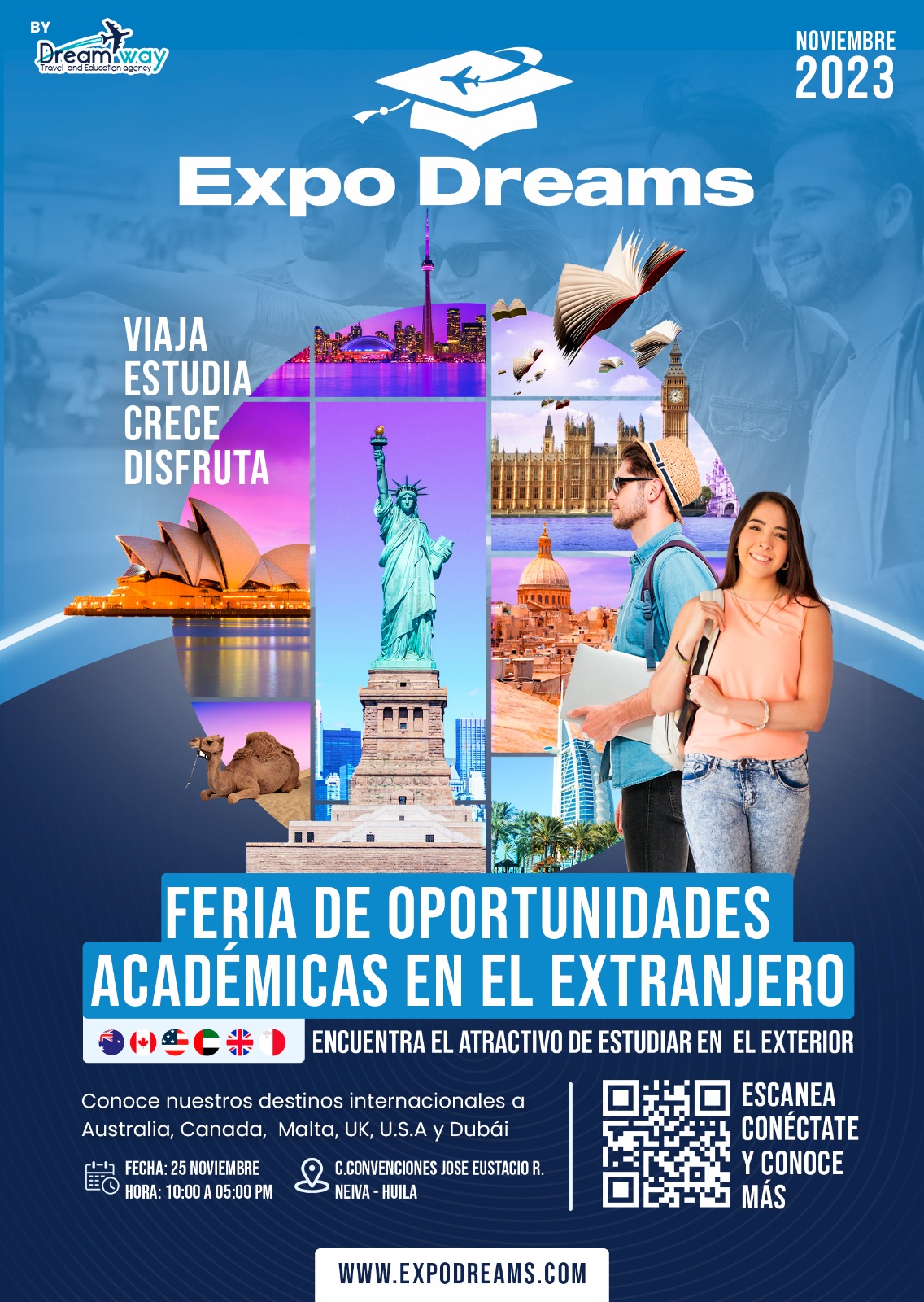 Expo Dreams es un evento que se desarrollará en Neiva, en el departamento del Huila, con el fin de orientar a todas las personas que estén interesadas en inmigrar con estudios a Australia, Canadá, Malta, UK y estados unidos. Es por ello que en este lugar encontraras desde asesores especializados, así como escuelas de inglés, collages, universidades y más. Para registrarte a nuestro evento puedes ingresar a: https://expodreams.dreamway.com.au/inscribete/